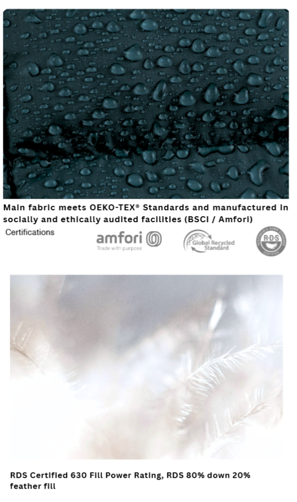 80/20 down-feather fill - (Impressive 630 Fill Power, RDS-Supplier Certified) exceptional warmth without bulk.